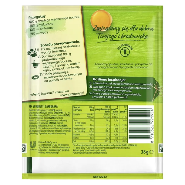 Chętnie sięgasz po dania z makaronem? Wolisz sosy o kremowej konsystencji ? Sięgnij po Fix Knorr Spaghetti Carbonara z dodatkiem wędzonego boczku i pachnących przypraw. Polej nim swój ulubiony makaron, a wynik zaskoczy nie tylko Ciebie. Wypełnij kuchnię intensywnym aromatem, który sam przyciągnie domowników do stołu. Fix to prosty i szybki sposób na smaczne danie zachwycające wyjątkowym, wyrazistym smakiem.